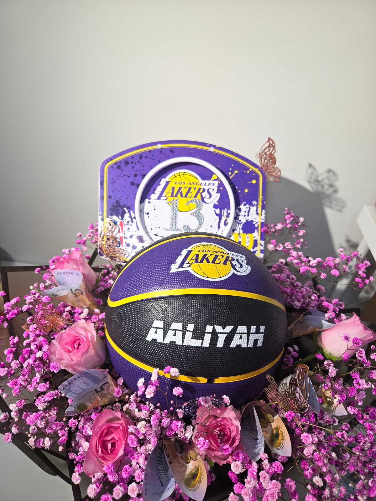Celebrate in style with a personalized Laker's ball, complemented by vibrant flowers and a touch of cash—making every gift a slam dunk!